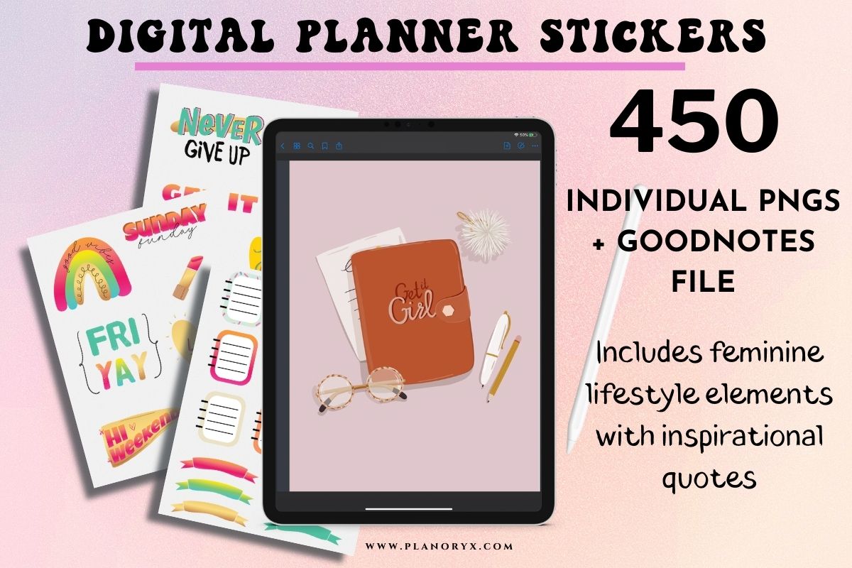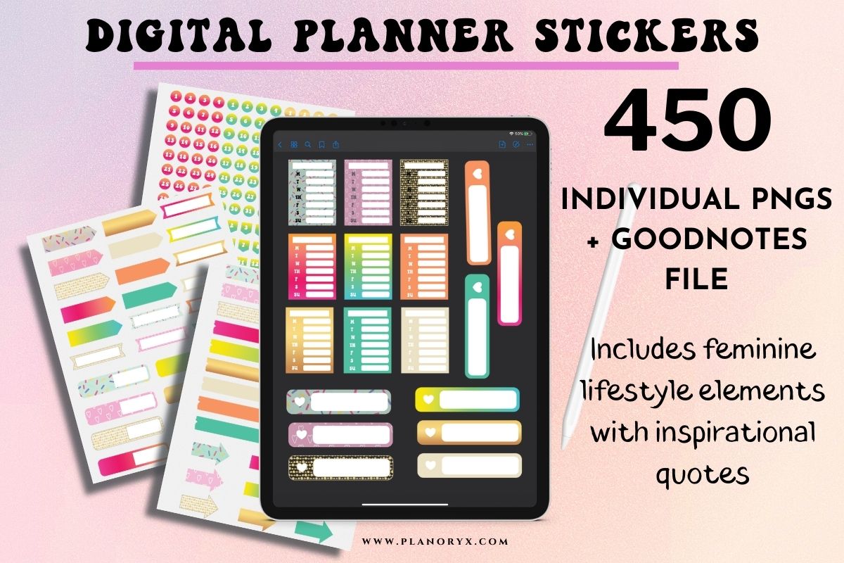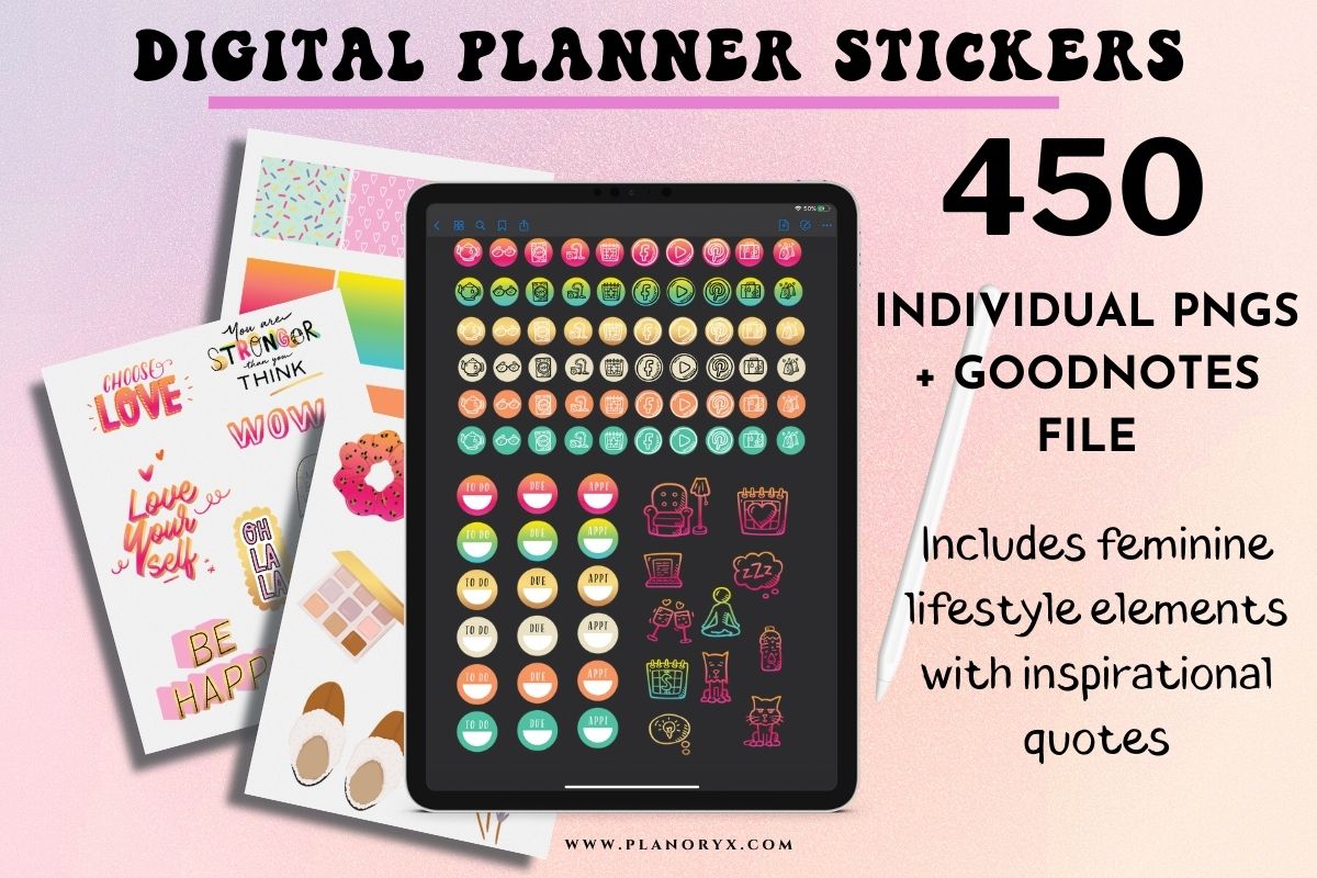 450 transparent feminine colorful bright stickers to create beautiful planner pages in your IOS or Android digital planner program.